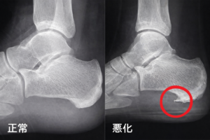 カカトの骨に負担がかかり針(骨棘)ができてきます。