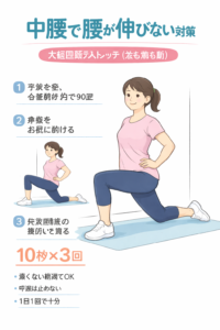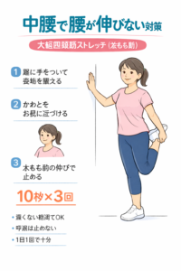 腰を伸ばす前に、太もも前→股関節前を10秒ずつ伸ばします。